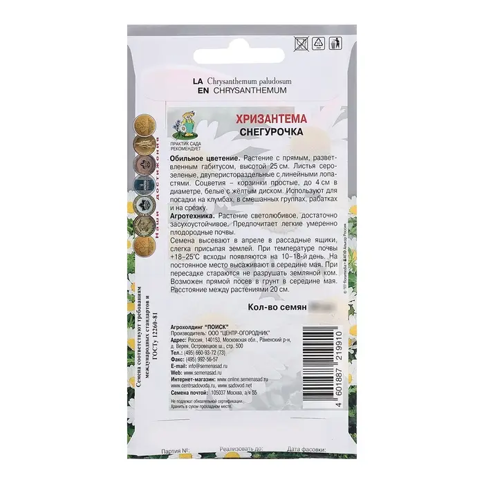 Семена Хризантема Снежный шар /Сотка/ 0,05г/ бел. махр. девичья h-30см, d-4см/*1800