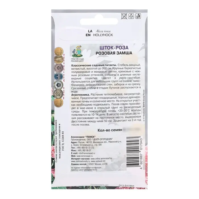 Классические садовые гиганты. Стебель мощный, ветвистый, высотой до 200 см. Крупные бархатистые полумахровые и махровые цветки, кремовые с нежным розовым оттенком, собраны в длинные кистевидные соцветия. Цветет в июле-сентябре. Используются для небольших групп на газоне, миксбордеров, декорирования стен, заборов и на срезку. Срезанные стебли в стадии бутонов распускаются в воде.Агротехника. Растение теплолюбивое, засухоустойчивое. Предпочитает плодородные, хорошо дренированные почвы и солнечное место. На открытых участках необходимо подвязывать. Посев семян производят в мае-июне в открытый грунт на разводочные гряды. При температуре почвы +18°С всходы появляются на 14-20 день. В августе-сентябре растения рассаживают на постоянное место, выдерживая расстояние между ними 50 см.Семена соответствуют требованиям международных стандартов и ГОСТу РФ 12260-81