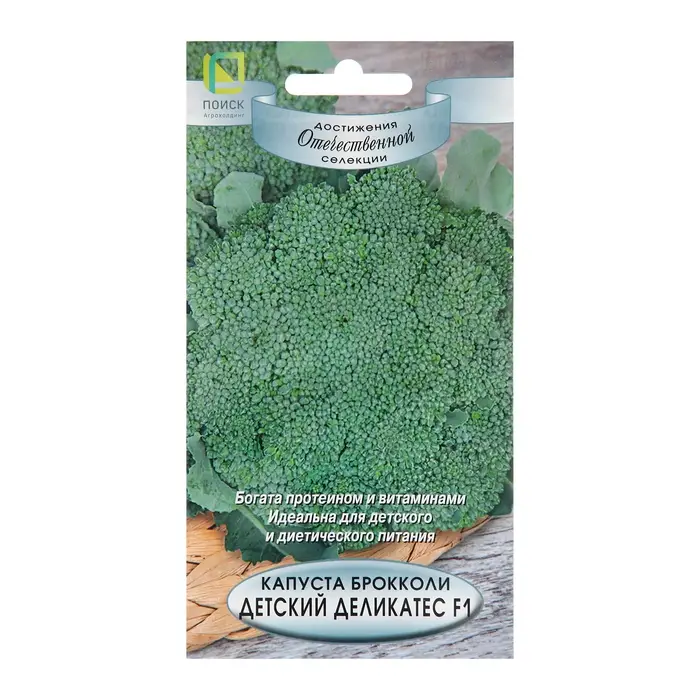 Капуста брокколи Детский деликатес F1 - богата протеином и витаминами Раннеспелый гибрид: 75-80 дней от всходов до созревания Масса головки: до 0,8 кг Растение в один стебель формирует мелкобугристую головку серо-зеленого цвета, средней плотности с кроющими листьями Содержит метионин и холин, которые препятствуют накоплению в организме холестерина и предупреждают развитие атеросклероза Рекомендуется для домашней кулинарии, длительного хранения в холодильнике и замораживания