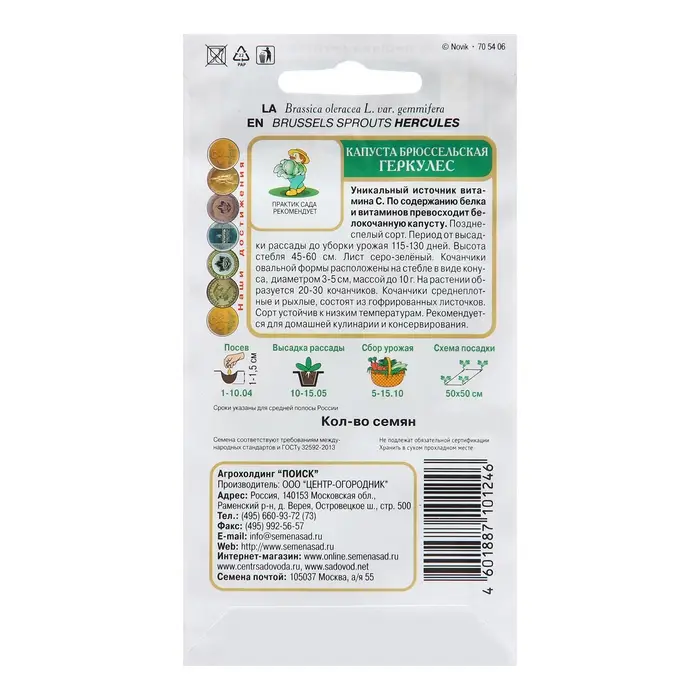 Капуста брюссельская Геркулес - уникальный источник витамина С. Уникальный источник витамина С. По содержанию белка и витаминов превосходит белокочанную капусту. Позднеспелый сорт. Период от всходов до уборки урожая 145-160 дней. Высота стебля 45—60 см. Лист серо-зелёный. Кочанчики расположены на стебле в виде конуса, форма их овальная, диаметр 3-5 см, масса 10-12 г. На растении образуется 20—30 кочанчиков. Кочанчики среднеплотные и рыхлые, состоят из гофрированных листочков. Сорт устойчив к низким температурам. Рекомендуется для домашней кулинарии и консервирования.