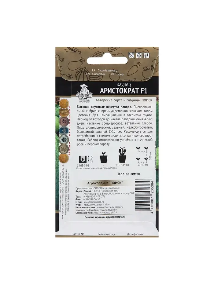 Огурец Аристократ F1 - высокая урожайность и товарность Период от всходов до начала плодоношения 42-45 дней Растение среднерослое, преимущественно женского типа цветения Плоды цилиндрические, тёмно-зелёные, белошипые, длиной 8-12 см, универсального назначения В узле формируются 2-3 и более завязей Устойчив к кладоспориозу, толерантен к мучнистой росе и пероноспорозу