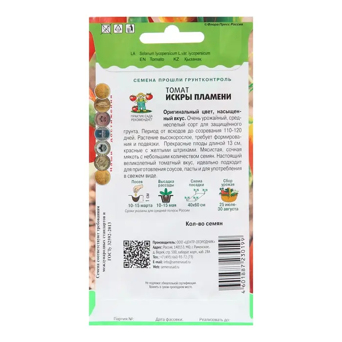 Томат Искры пламени - оригинальный цвет, насыщенный вкус. Очень урожайный, среднеспелый сорт для пленочных теплиц. Период от всходов до созревания 110-120 дней. Растение высокорослое, требует формирования и подвязки. Прекрасные плоды длиной 13 см, оригинальной окраски. Мясистая, сочная мякоть с небольшим количеством семян. Настоящий великолепный томатный вкус, идеально подходит для приготовления соусов, пасты и для употребления в свежем виде.