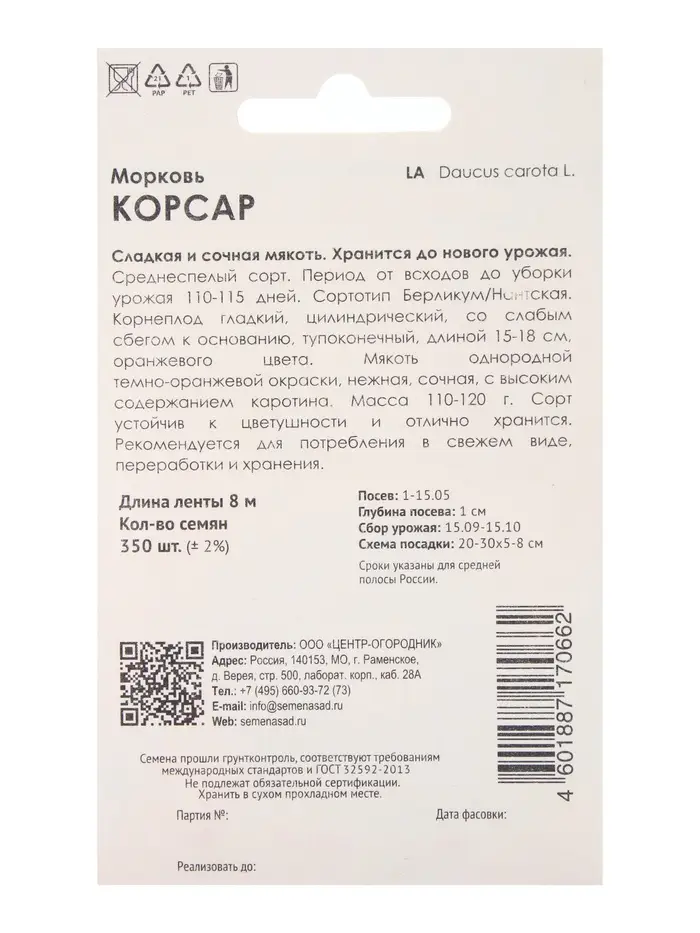 Сорт моркови в данной упаковке идеально подходит для тех, кто ищет надежность и удобство в посадке. Средние сроки созревания позволяют планировать ваш урожай и получать постоянно свежие овощи в течение сезона. Агрономический срок годности семян составляет 3 года, что дает вам время для экспериментирования и поиска идеального момента для посадки.
