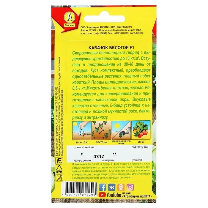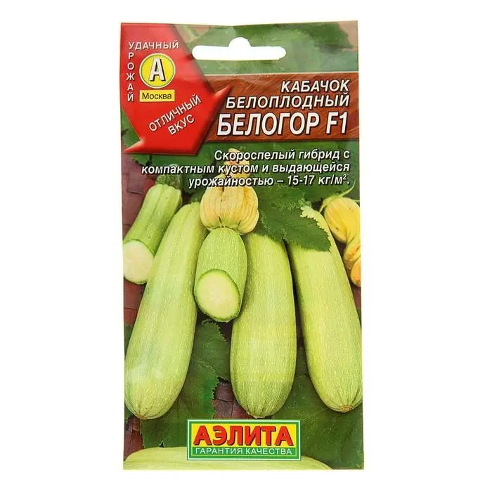 Кабачковые семена «Белогор» — раннеспелый гибрид с выдающейся урожайностью, плодоносит примерно на 40-й день после всходов.