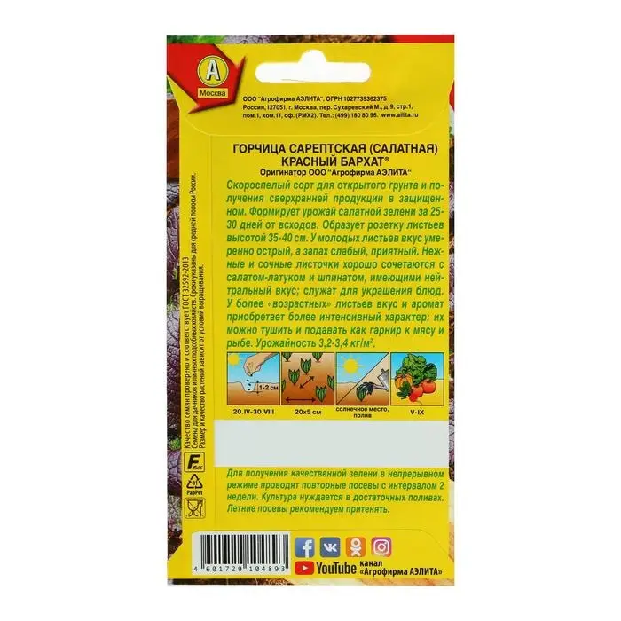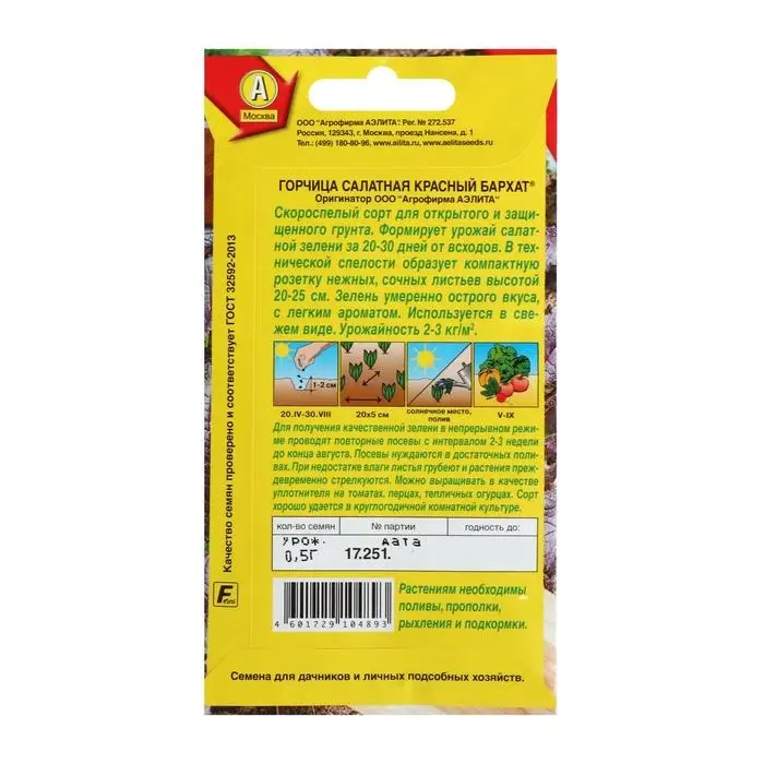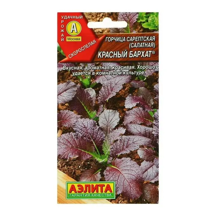 «Красный бархат» — скороспелый сорт горчицы для открытого и защищённого грунта. Растение формирует зелень с приятным умеренно-острым вкусом.