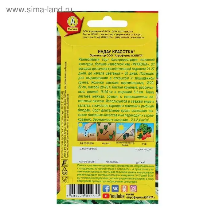 Семена Индау (Рукола) "Акрополь" культурная, скороспелая, орехово-горчичный вкус, 1 г