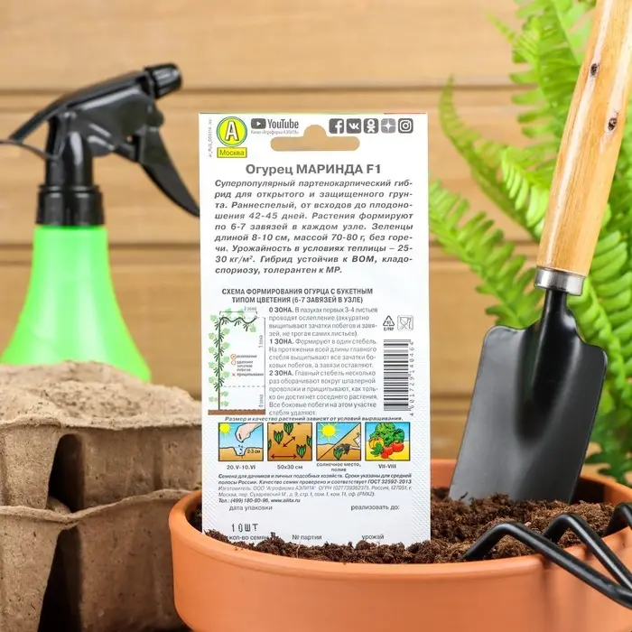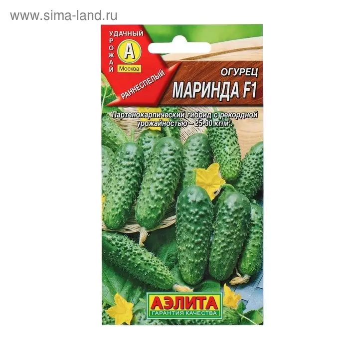 «Маринда» — это популярный раннеспелый партенокарпический сорт для открытого и защищённого грунта. Плодоношение начинается на 45–50-й день от всходов.