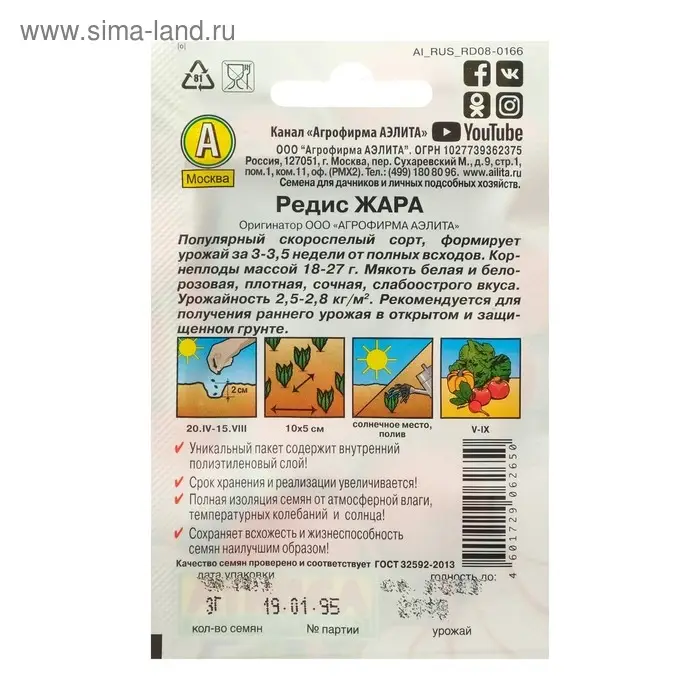 Редис «Жара» — это красно-малиновый корнеплод, округлой или эллиптической формы. Мякоть белая и бело-розовая, плотная, сладкая, слабоострого вкуса. Масса корнеплода 13-27 г. Сорт устойчив к цветушности. Предназначен для выращивания в открытом и защищённом грунте.