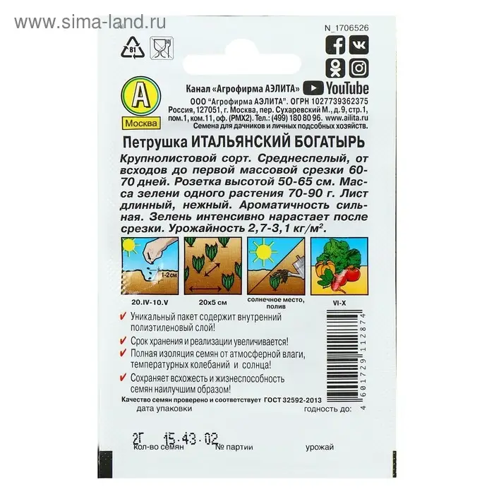 Благодаря внутреннему полиэтиленовому слою пакет не пропускает влагу и увеличивает срок годности семян до 2-ух лет.