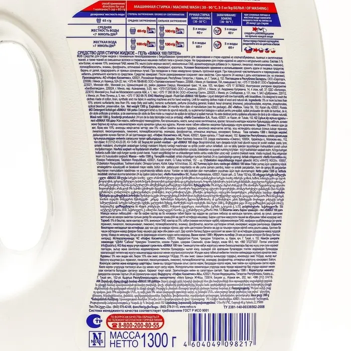 Жидкое средство для стирки BiMax "100 пятен", гель, универсальное, 1.3 л