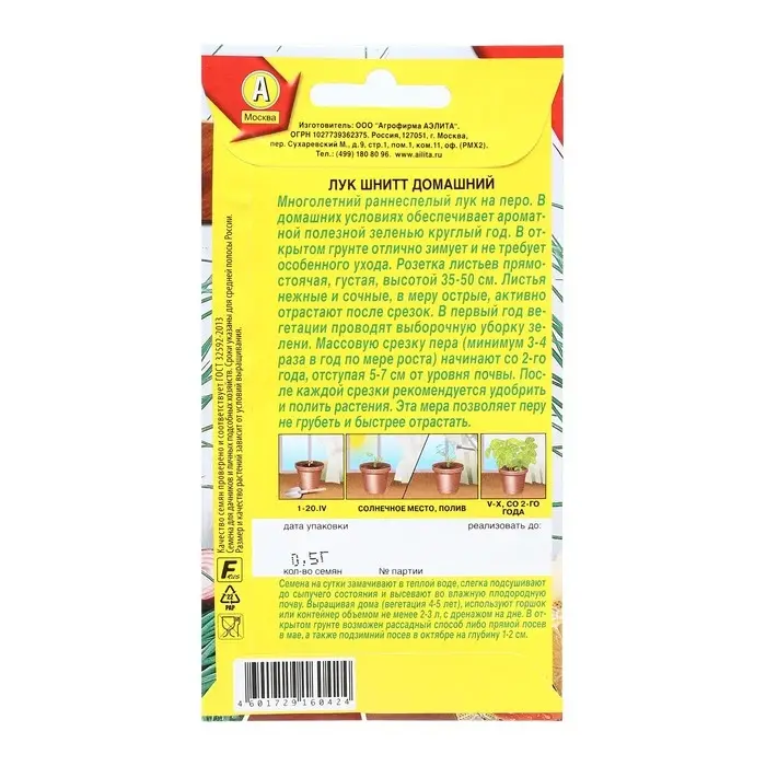 Многолетний раннеспелый лук на перо. В домашних условиях обеспечивает ароматной полезной зеленью круглый год. В открытом грунте отлично зимует и не требует особенного ухода. Розетка листьев прямостоячая, густая, высотой 35-50 см. Листья нежные и сочные, в меру острые, активно отрастают после срезок. В первый год вегетации проводят выборочную уборку зелени. Массовую срезку пера (минимум 3-4 раза в год по мере роста) начинают со 2-го года, отступая 5-7 см от уровня почвы. После каждой срезки рекомендуется удобрить и полить растения. Эта мера позволяет перу не грубеть и быстрее отрастать.