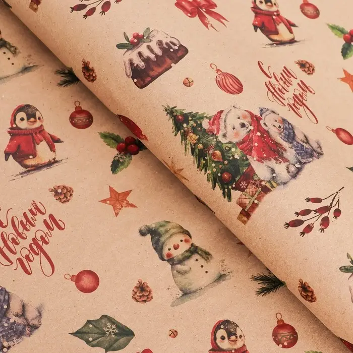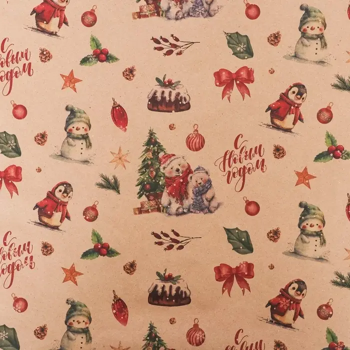 Бумага упаковочная новогодняя крафт бурый "Медвежата", 50 х 70 см.