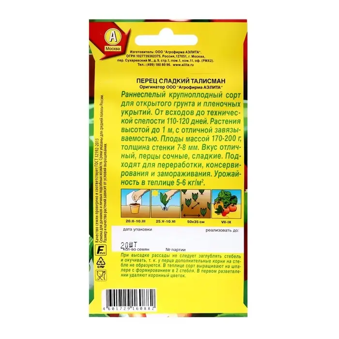 Эти семена — ваш ключ к успешному выращиванию сладких перцев. Сладкий и насыщенный вкус, простота ухода и высокий урожай делают «Талисман» популярным выбором среди садоводов. Долгий срок годности семян позволяет планировать посадку на несколько сезонов вперёд.