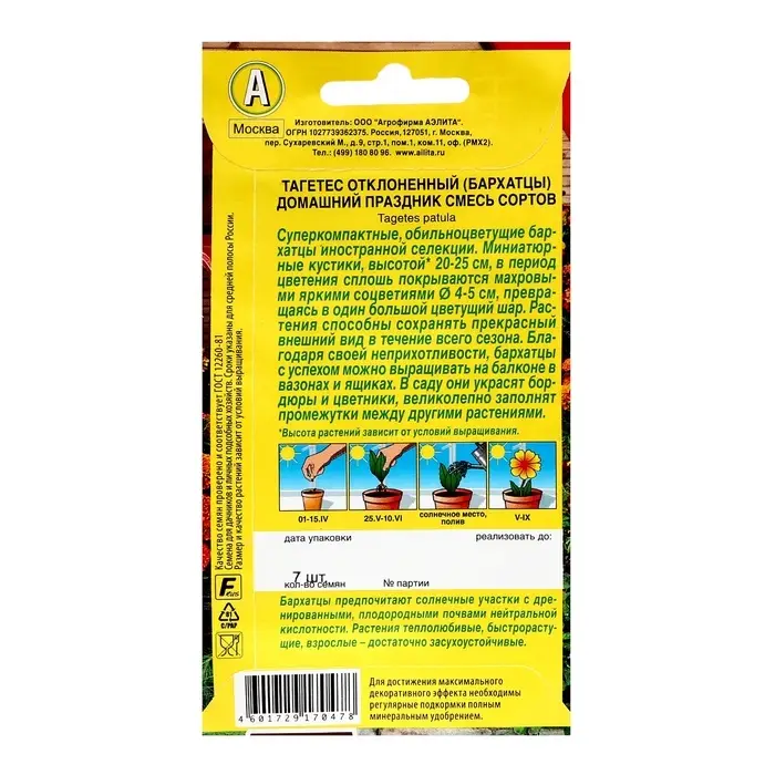 Семена цветов Бархатцы "Домашний праздник" смесь сортов, ц/п 7 шт
