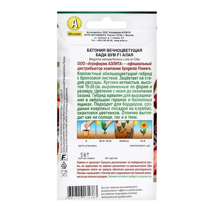 Семена цветов Бегония "Бада бум" F1, алая, ц/п, 5 шт