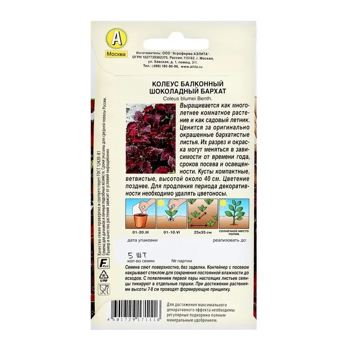 Семена цветов Колеус балконный "Шоколадный бархат", ц/п, 5 шт