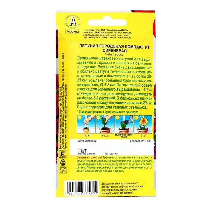 Семена цветов Петуния "Городская компакт" F1 сиреневая, ц/п, 7 шт