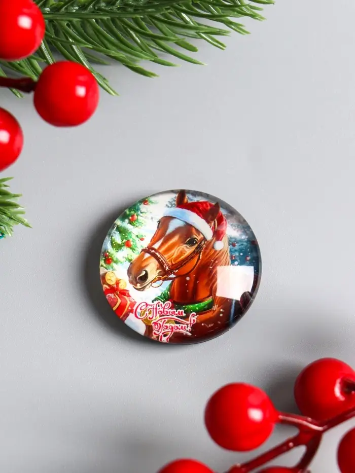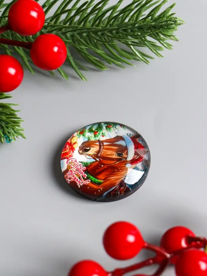 Магнит стекло "Конь в новогоднем колпаке - С Новым годом" d=3,3 см