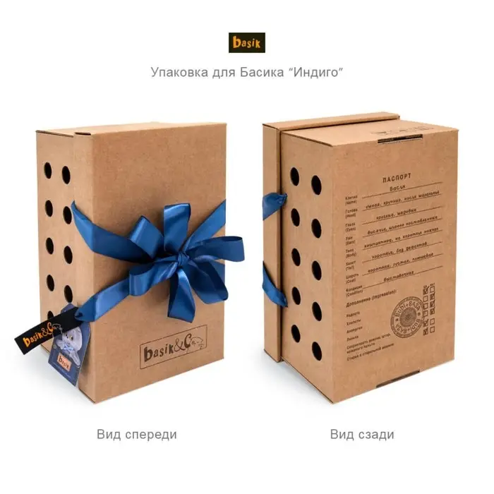 - Стильный образ Басика состоит из классической куртки цвета индиго и широких штанов из мягкого вельвета цвета спелой вишни, а на шейке у Басика небольшой галстук‑бабочка из репсовой ленты цвета красного апельсина.