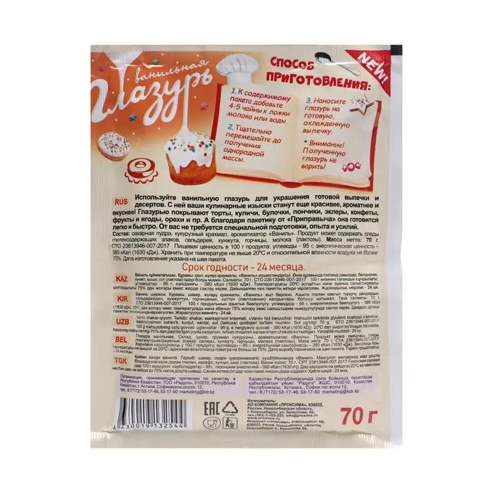 Продукт безопасен и прекрасно сочетает в себе качество и удобство. Упаковка в 70 г позволяет легко контролировать количество используемой глазури, обеспечивая максимальную экономию и результативность. Ванильная глазурь «Приправыч» станет отличным помощником как для профессиональных кондитеров, так и для домашних кулинаров, желающих добавить нотку стиля и изысканности в свои десерты.