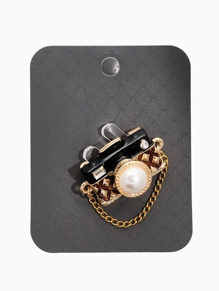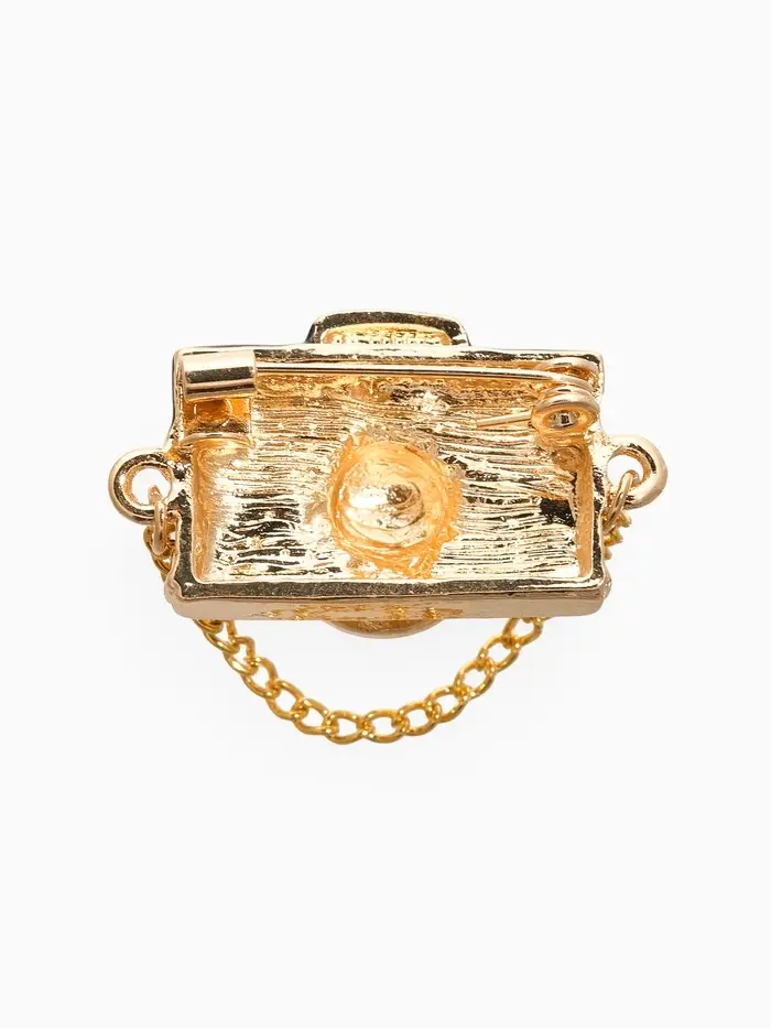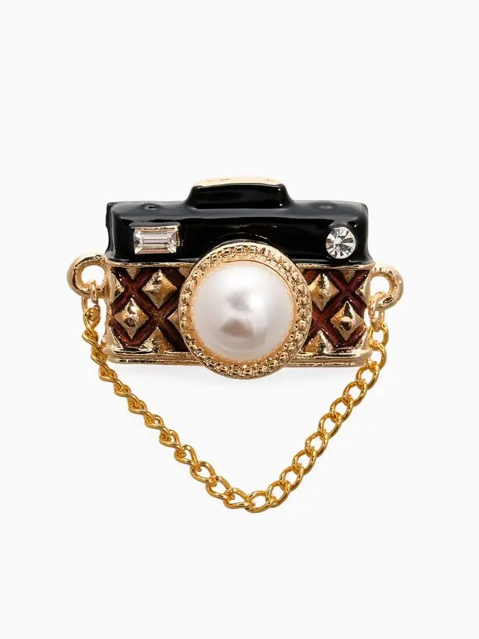 Брошь "Фотоаппарат" с жемчугом, чёрно-коричневая в золоте