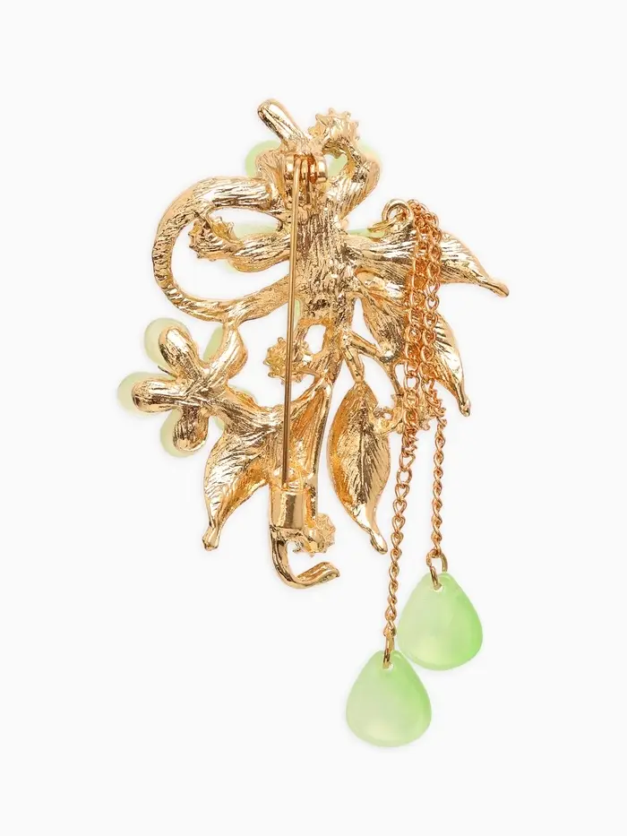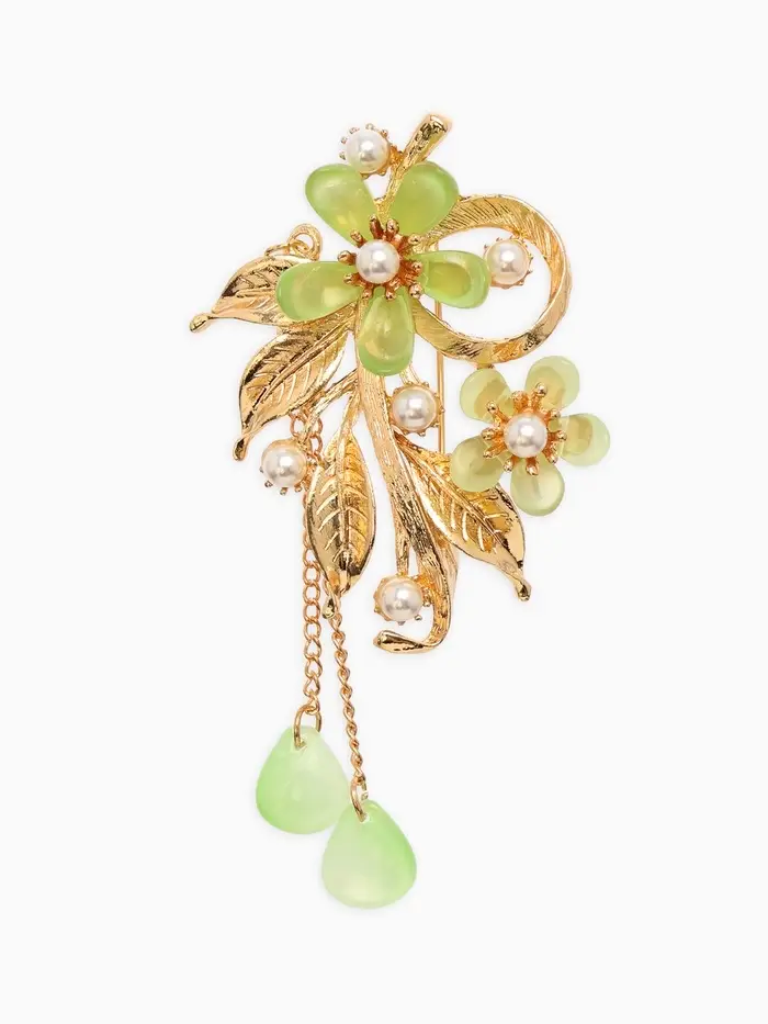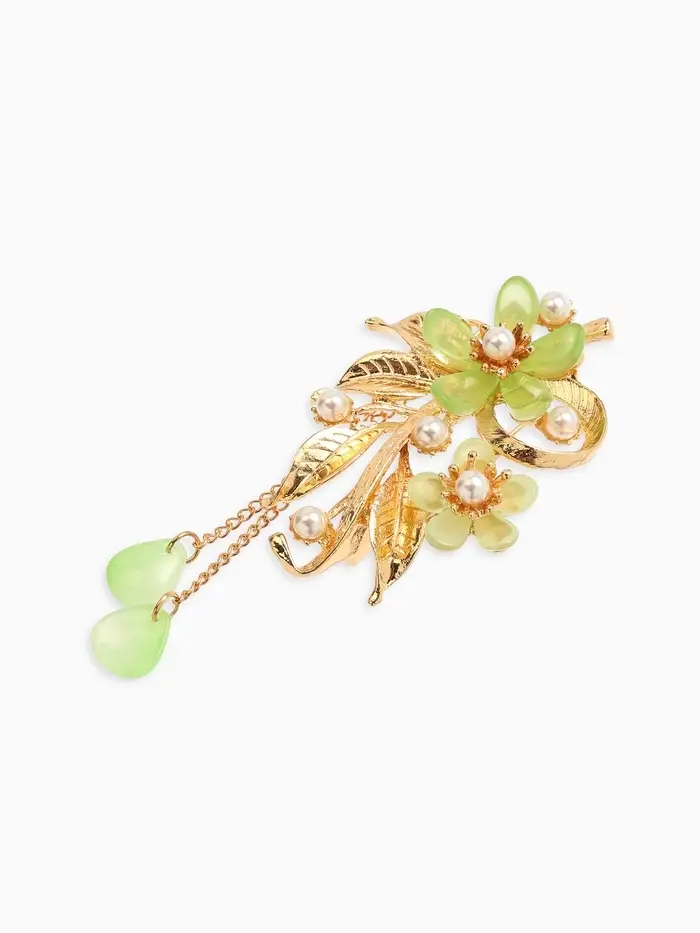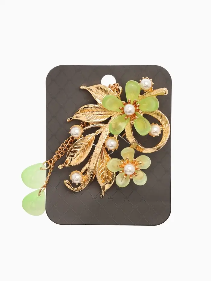 Брошь с жемчугом "Цветы", цвет светло-зеленый в золоте
