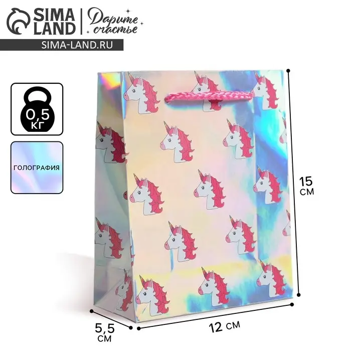 Пакет подарочный голографический, упаковка, «Единорожки», 12 х 15 х 5.5 см
