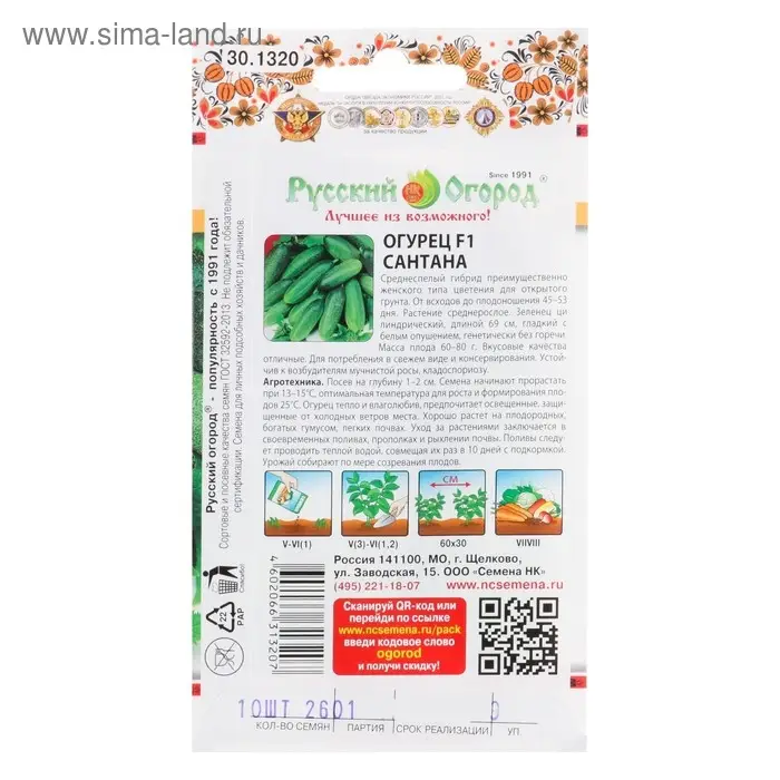 Семена Огурец "Сантана" F1, серия Русский огород, среднесп, партенокарп, 10 шт