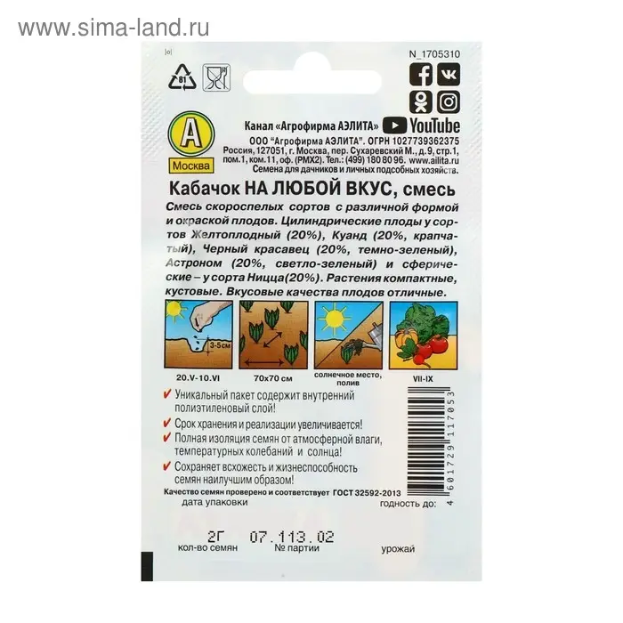 Смесь состоит из 5 сортов скороспелых кабачков: