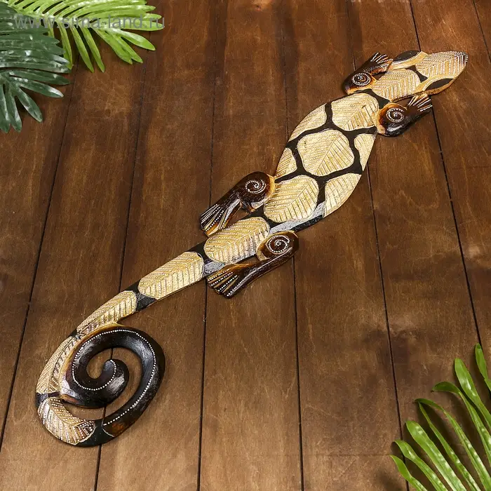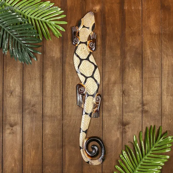 Не каждый осмелится разместить такое панно ручной работы в своем интерьере. Ведь порой кажется, что это настоящая живая рептилия. Искусные индонезийские мастера изобразили всё настолько детализировано четко, что хочется прикоснуться к панно дерево "Геккон" 78х13х1 см и ощутить тонкие линии изгибов этой «ящерицы счастья».