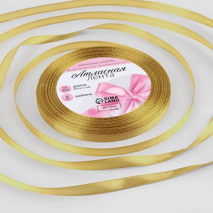 Лента атласная, 6 мм × 23 ± 1 м, цвет золотой №204