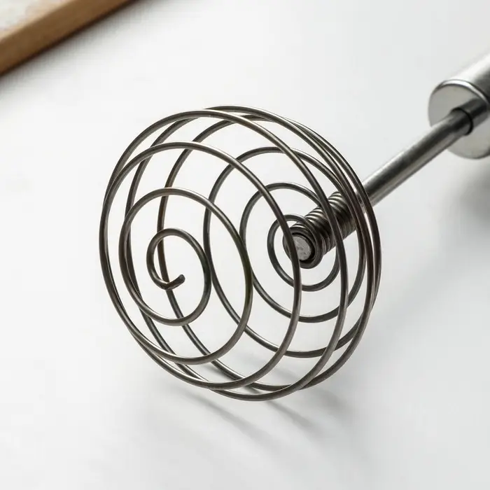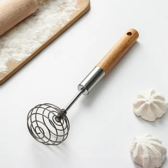 - Эстетичность: сочетание серебристого цвета стали и бежевого оттенка дерева делает венчик стильным дополнением к любой кухне.