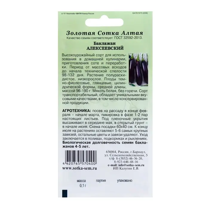 Семена Баклажан "Алёшка", F1, скороспелый, 0,05 г