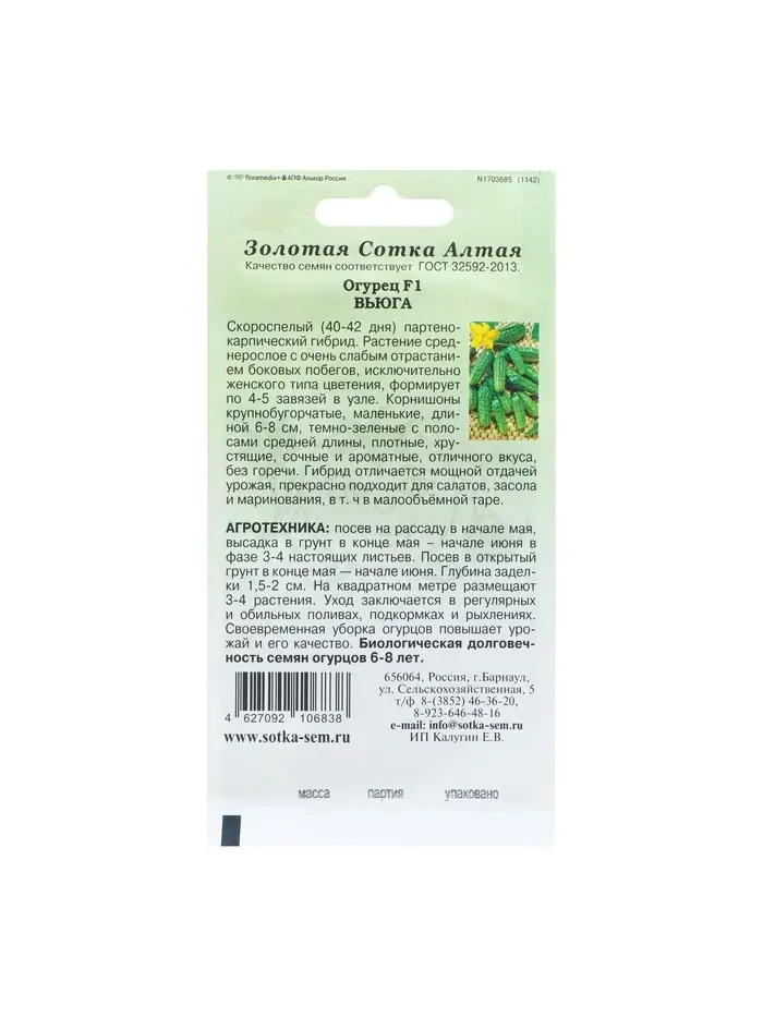 Семена Огурец "Вьюга F1" партенокарпический, 0,15 г