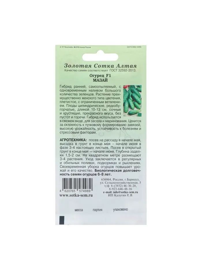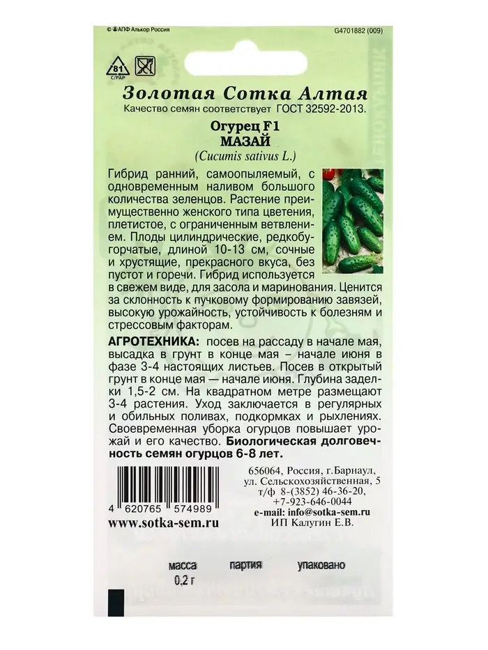Семена Огурец "Мазай F1" партенокарпический, 0,15 г