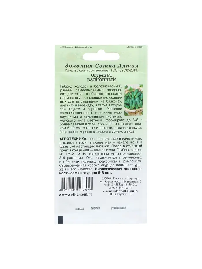 Семена огурцов «Балконный F1» подойдут для тех, кто ищет универсальное решение для домашнего или огородного выращивания. Этот партенокарпический сорт отличается своей вьющейся и ампельной природой, что делает его идеальным для различных условий. Яркие, свежие плоды, достигающие длины от 18 до 22 см, готовы к сбору уже через ранние 48 дней.