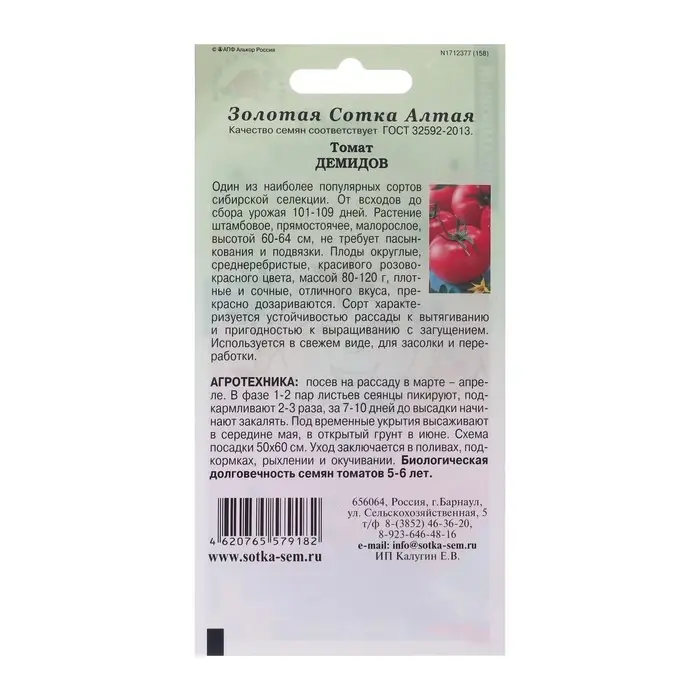Семена Томат "Демидов", скороспелый, 0,1 г