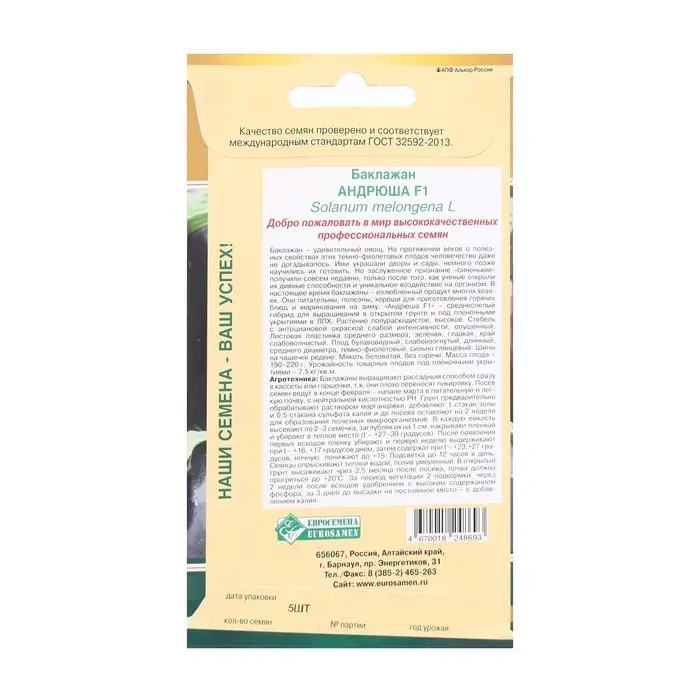 Семена баклажанов "Андрюша F1" Евросемена среднеспелые, без горечи