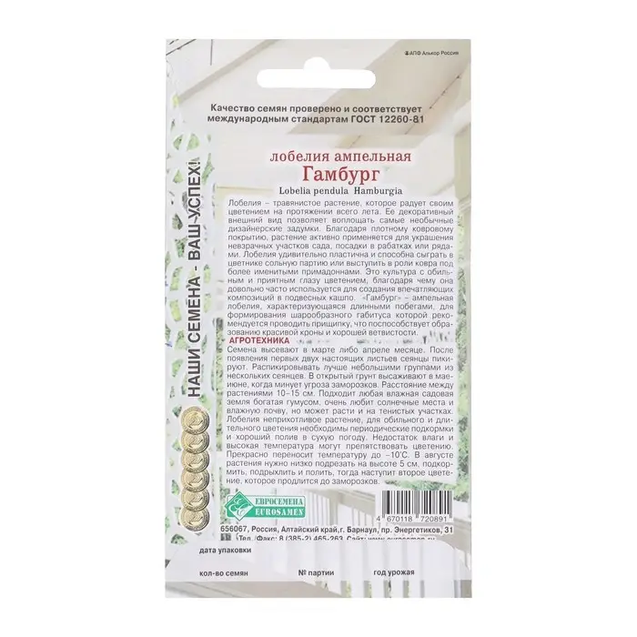 Семена Цветов Лобелия ампельная Гамбург, 0,1 г