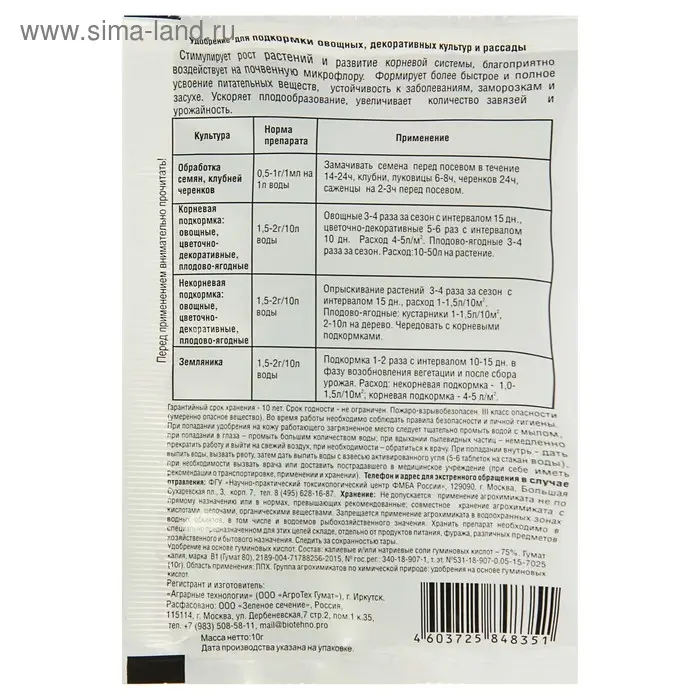 Удобрение "Гумат Калия" сухой, 10 г
