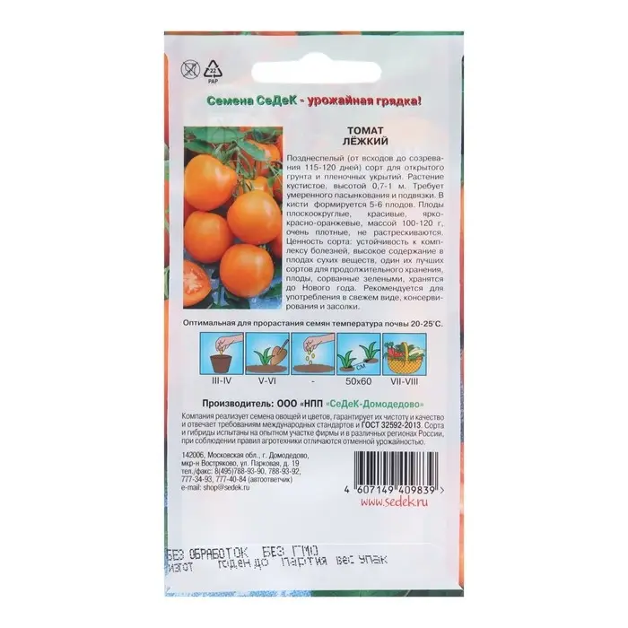 Позднеспелый (от всходов до созревания 115-120 дней) сорт для открытого грунта и пленочных укрытий. Растение кустистое, высотой 0,7- 1 м. Требует умеренного пасынкования и подвязки. В кисти формируется 5-6 плодов. Плоды плоскоокруглые, красивые, ярко-красно-оранжевые, массой 100-120 г, очень плотные, не растрескиваются. Ценность сорта: устойчивость к комплексу болезней, высокое содержание в плодах сухих веществ, один их лучших сортов для продолжительного хранения, плоды, сорванные зелеными, хранятся до Нового года. Рекомендуется для употребления в свежем виде, консервирования и засолки.