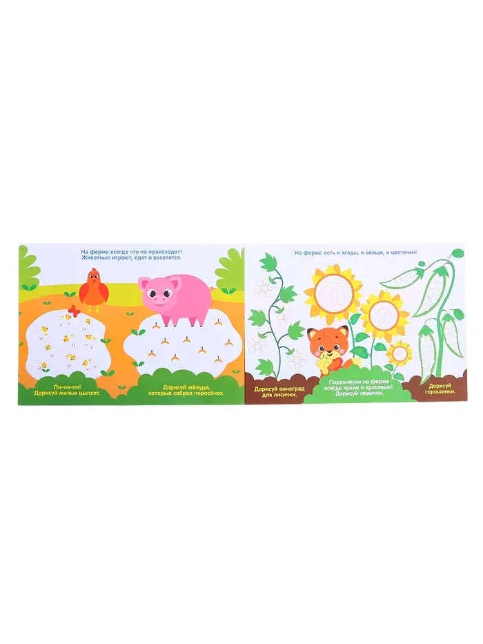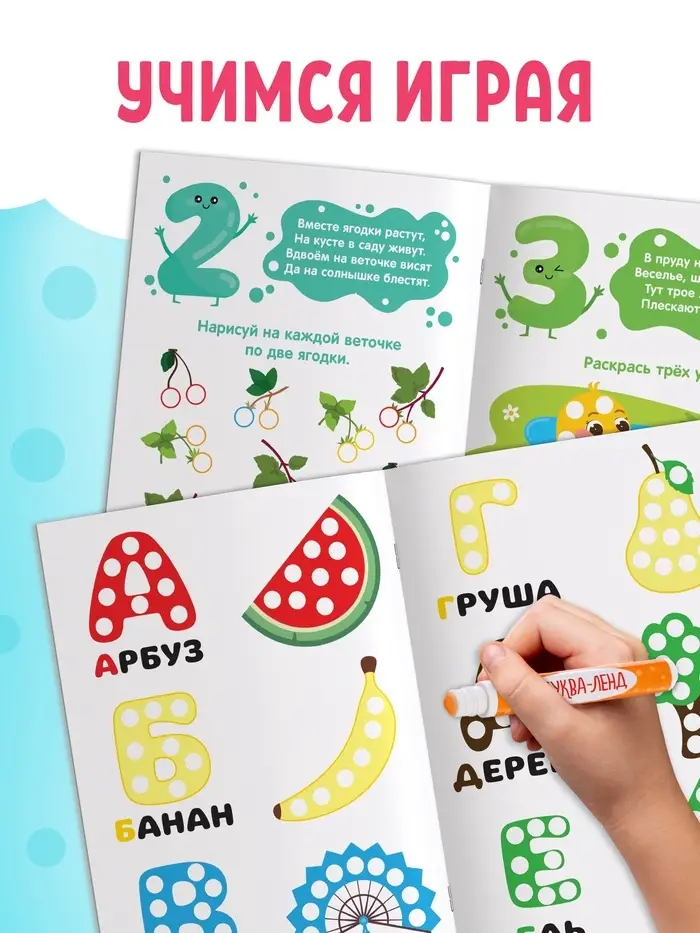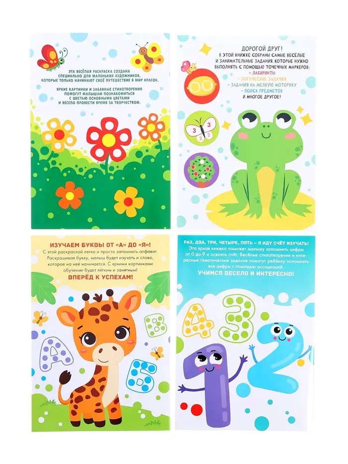 - Включает 8 раскрасок с изображениями животных, букв, цифр и надписей.
