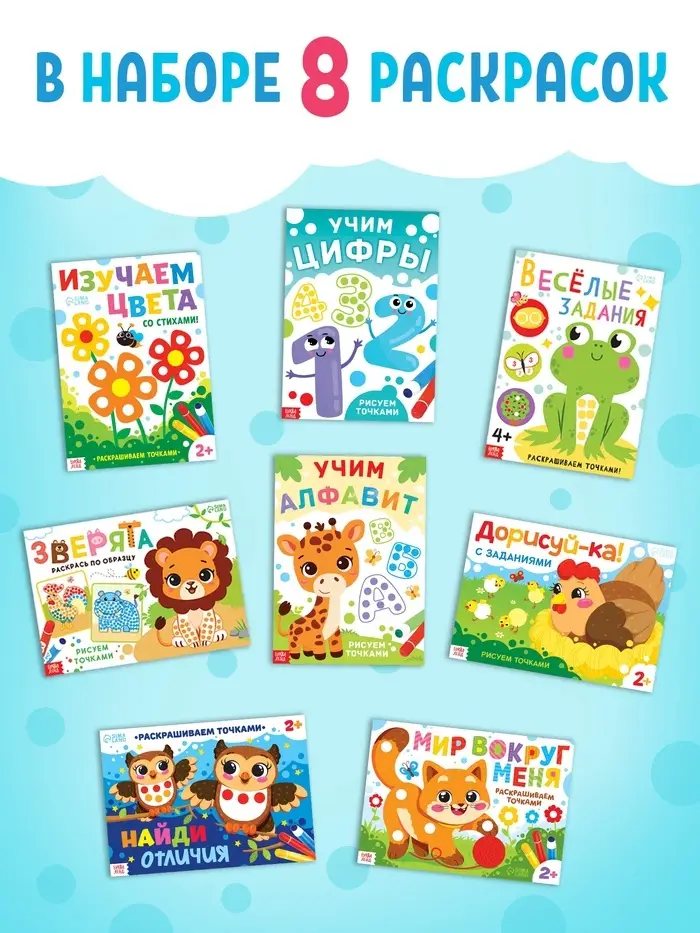 Раскраски набор «Рисуем точками», 6 точка - маркеров, 8 раскрасок