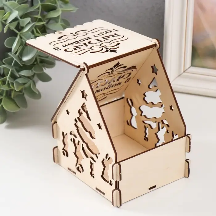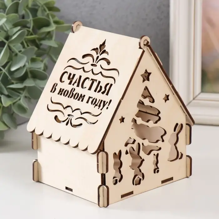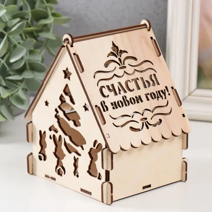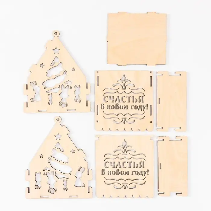 Заготовка новогодняя шкатулка-домик "Зайки" натуральный 12х10х14 см (Новогодний набор 7 деталей) 977