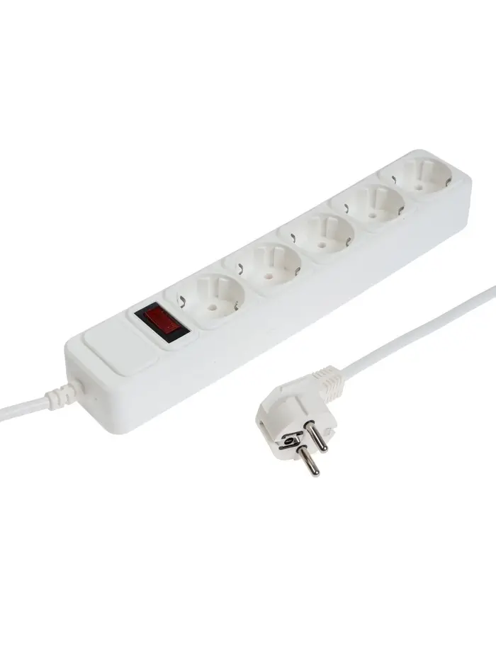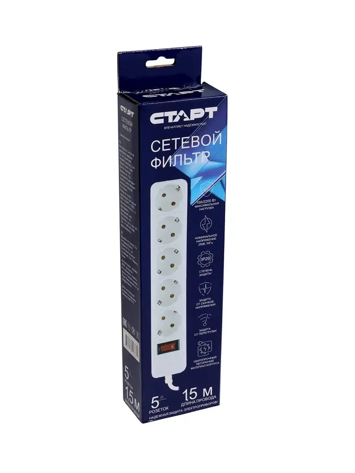 Сетевой фильтр СТАРТ, 5 розеток, 1,5 м, 10А, ПВС 3*0,75 мм2, с з/з, с выкл, IP 20, белый