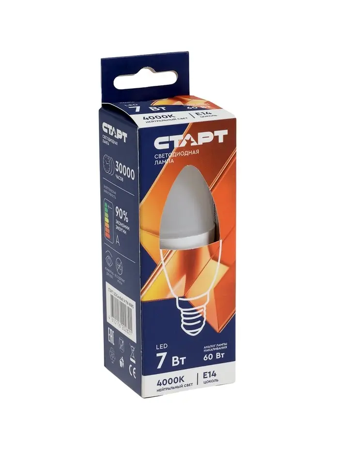 Лампа светодиодная СТАРТ, 7 Вт, Е14, С37, 4000К, 560 Лм холодный (нейтральный) свет
