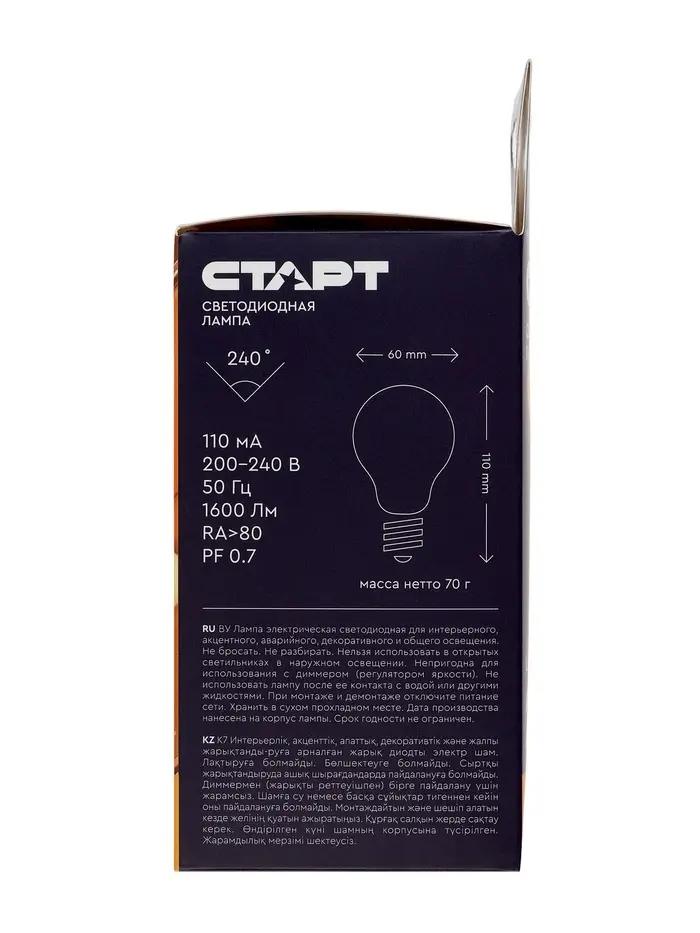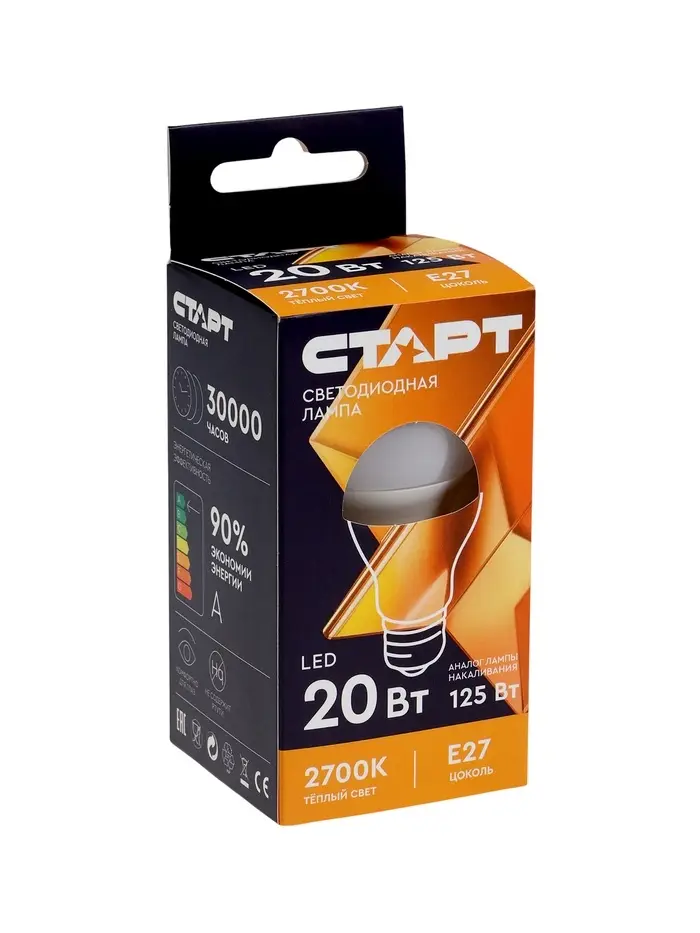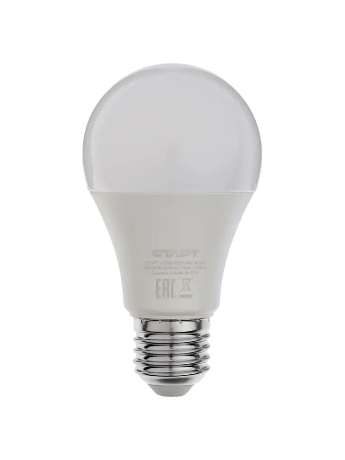 Лампа светодиодная СТАРТ, 20 Вт, Е27, А60, 2700К, 1600 Лм, теплый свет