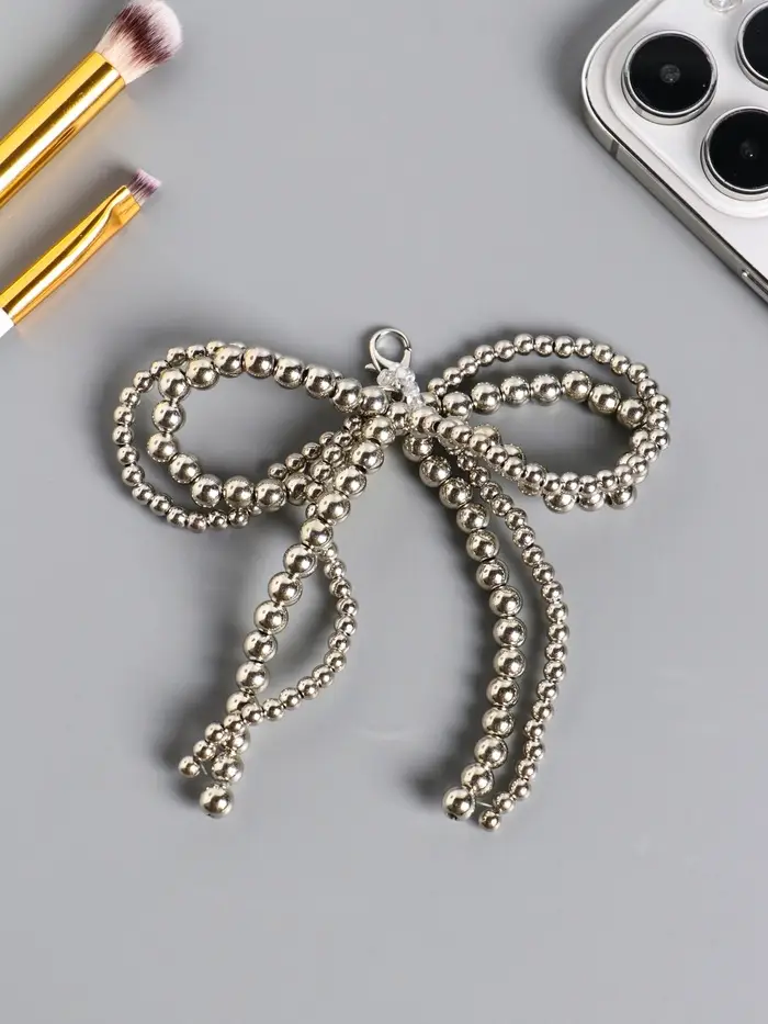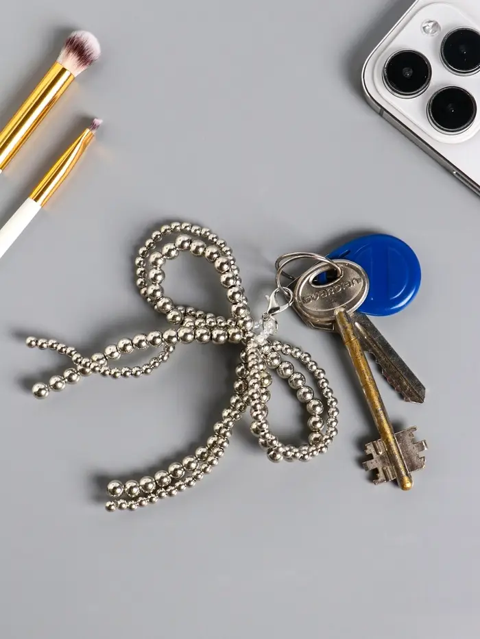 Брелок на карабине "Двойной бант" серебро, бусины d=0,4 и 0,5 см 11,5х9,5х1 см