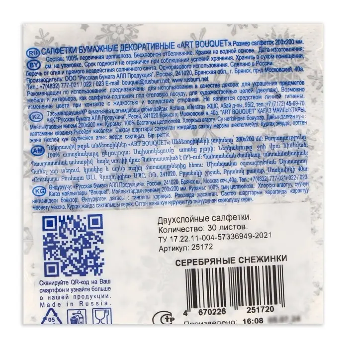 Салфетки бумажные Art Bouquet «Серебряные снежинки» — это двухслойные салфетки размером 20х20 см, которые станут прекрасным дополнением к вашему столу или интерьеру. Они изготовлены из высококачественной целлюлозы и красок на водной основе, что гарантирует их экологичность и безопасность для здоровья.