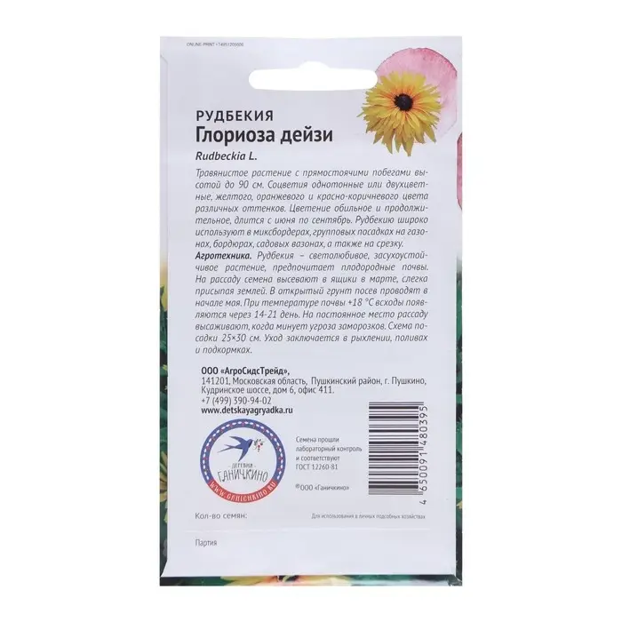 Травянистое растение с прямостоячими побегами высотой до 90 см. Соцветия однотонные или двухцветные, желтого, оранжевого и красно-коричневого цвета различных оттенков. Цветение обильное и продолжительное, длится с июня по сентябрь. Рудбекию широко используют в миксбордерах, групповых посадках на газонах, бордюрах, садовых вазонах, а также на срезку. Агротехника: Рудбекия – светолюбивое, засухоустойчивое растение, предпочитает плодородные почвы. На рассаду семена высевают в ящики в марте, слегка присыпая землей. В открытый грунт посев проводят в начале мая. При температуре почвы +18°С всходы появляются через 14-21 день. На постоянное место рассаду высаживают, когда минует угроза заморозков. Схема посадки 25×30 см. Уход заключается в рыхлении, поливах и подкормках. Штрих-код - 4650091480395